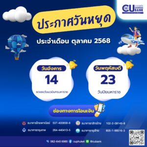 วันหยุด สหกรณ์เครดิตยูเนี่ยนเคหะรัษฎาภูเก็ต จำกัด 👉“ประจำเดือน ตุลาคม 2568”