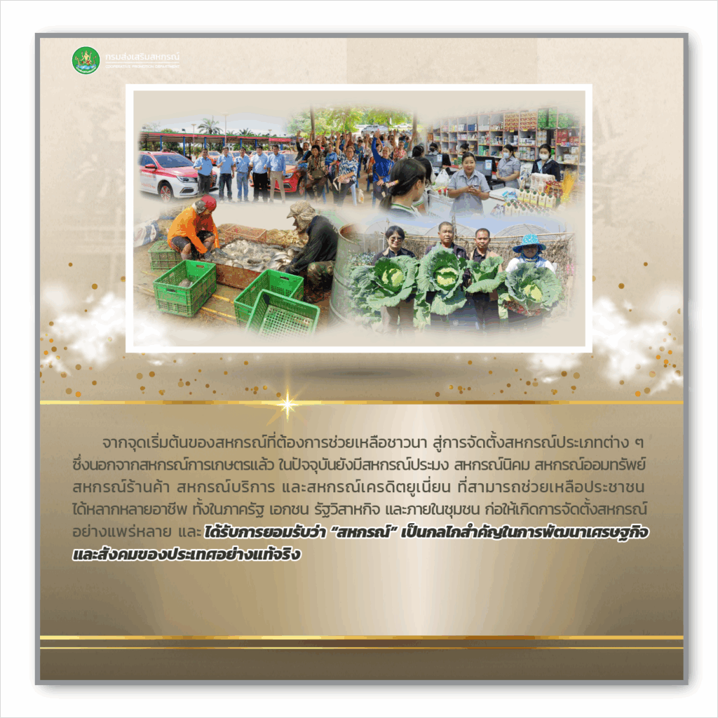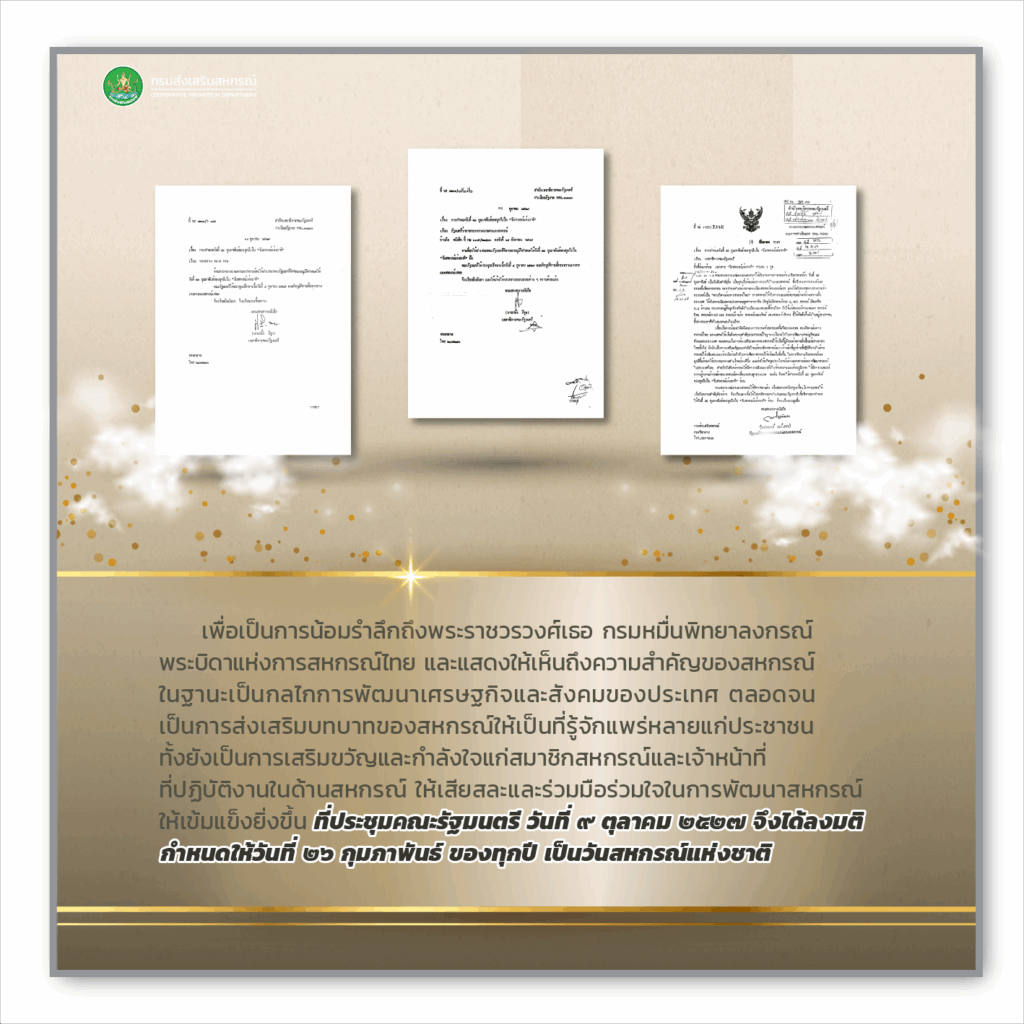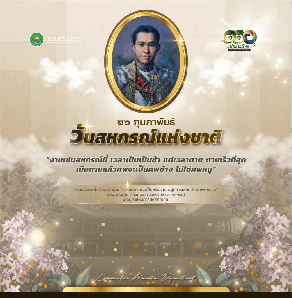 ขอขอบคุณข้อมูลจาก : สำนักพัฒนาและถ่ายทอดเทคโนโลยีการสหกรณ์ กรมส่งเสริมสหกรณ์ https://cooptrain.office.cpd.go.th/service/nationcoopday.html