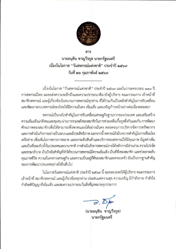 สารนายกรัฐมนตรี เนื่องในโอกาส “วันสหกรณ์แห่งชาติ” ประจำปี 2569