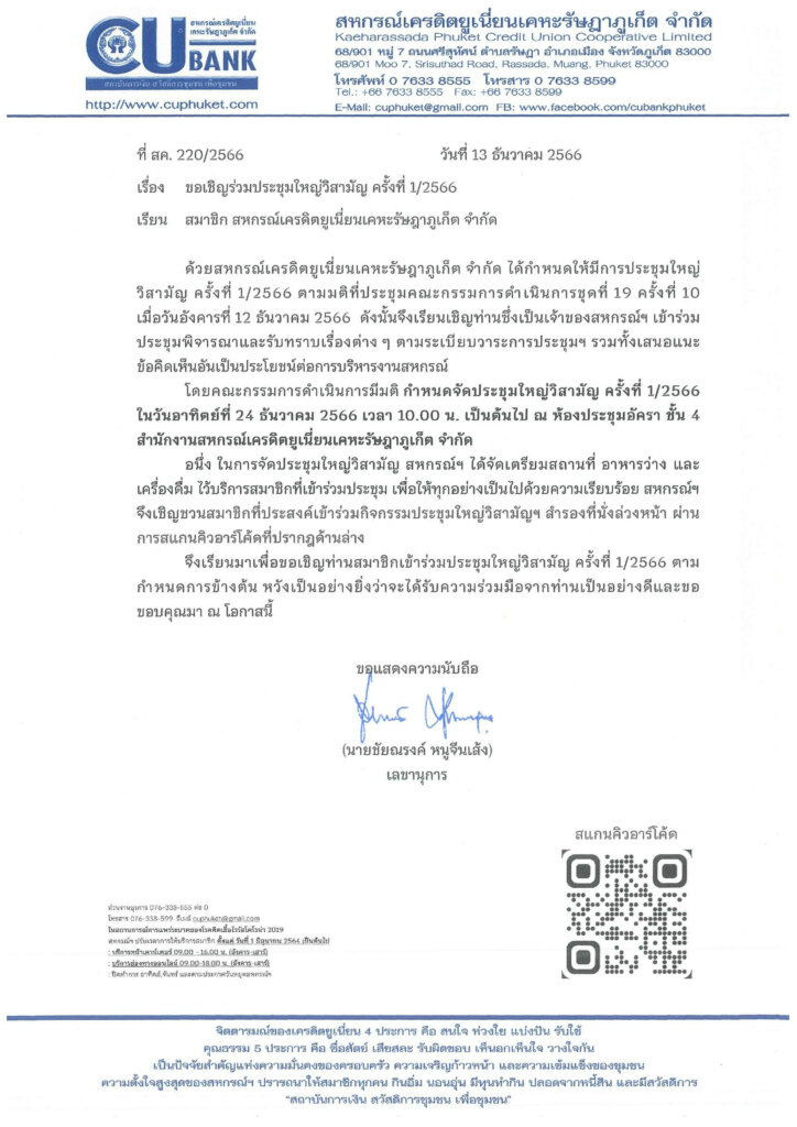 ขอเรียนเชิญสมาชิกสหกรณ์ เข้าร่วม การประชุมใหญ่วิสามัญ ครั้งที่ 1/2566 / ประกาศ / By Treepon Lamai ขอเรียนเชิญสมาชิกสหกรณ์ เข้าร่วม การประชุมใหญ่วิสามัญ ครั้งที่ 1/2566.วันอาทิตย์ที่ 24 ธันวาคม 2566เวลา 10.00 เป็นต้นไป( เริ่มลงทะเบียนหน้างาน เวลา 09.00 น. ).ณ ห้องประชุมอัครา ชั้น 4 สหกรณ์เครดิตยูเนี่ยนเคหะรัษฎาภูเก็ต จำกัด.สำรองที่นั่ง คลิก! https://forms.gle/9kKBRbBCjZdQucmSAหรือ ณ สำนักงานสหกรณ์ฯหมายเลขโทรศัพท์ 076-338555LINE (ไลน์) : @cubank อังคาร-เสาร์ เวลา 09.00-18.00 น..สอบถามเพิ่มเติม : 076-338555, 062-645 6985 LINE : @cubank อังคาร-เสาร์ เวลา 09.00-18.00 น.
